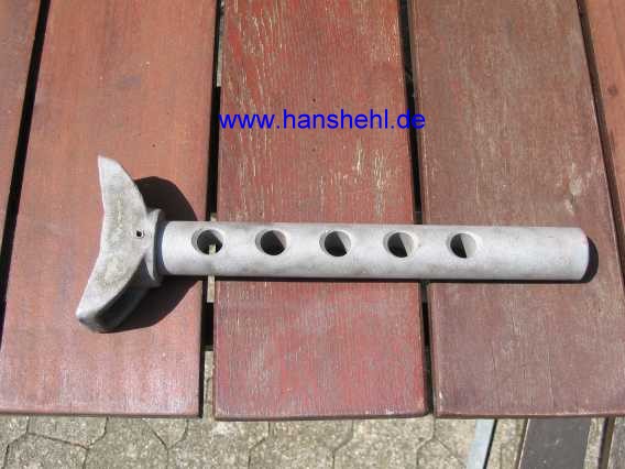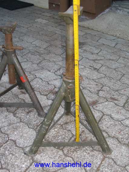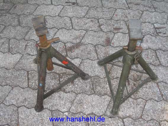 | Also Sandstrahlen siehe Tipp 2, Abschnitt 6, chemisch entrosten sieheTipp 2, Abschnitt 2, mit Drahtbürste blank polieren und auch grundieren und lackieren. Da war die Bundeswehrfarbe oliv Ral 6003 gerade recht. Rechts und links (4.Bild) stehen zwei Unterstellböcke für 1,5 to. | ![]() |