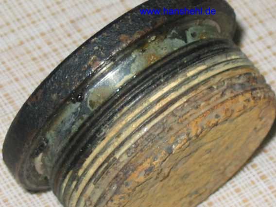 | Am 12.06.2003 habe ich nach 200.000 km beim Austauschmoter die Zylinderkopfdichtung erneuert (Bericht hier) und den Auspuffkrümmer abgebaut. So sieht man den fast 10 Jahre alten Tauchsieder. | ![]() |