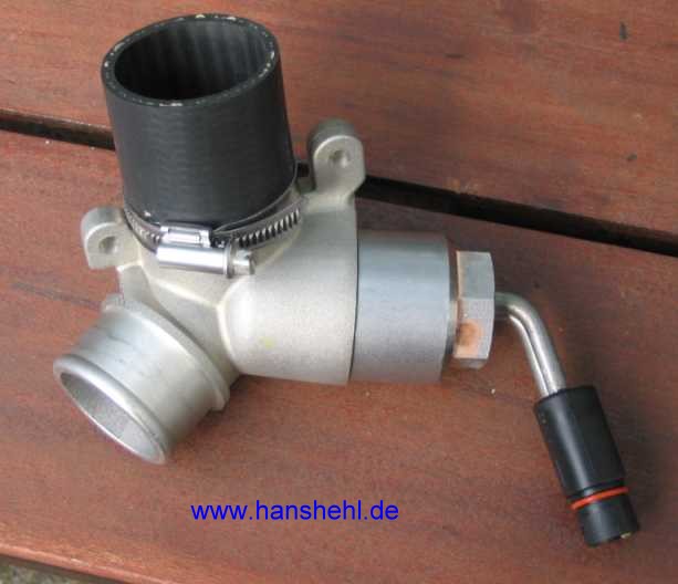 Ende Mai 2007 baute ich den gleichen Tauchsieder Typ 265 im G55AMG(K) ein, so gab es auch aktuelle Bilder. Der Tauchsieder wird bei den 8-Zylinder-Motoren in den Schlauch vom Kühler zur Wasserpumpe eingesetzt, dazu gibt es von Mercedes ein Gehäuse, das am Motorblock angeschraubt wird (Einbau-Beschreibung im Tipp75). |