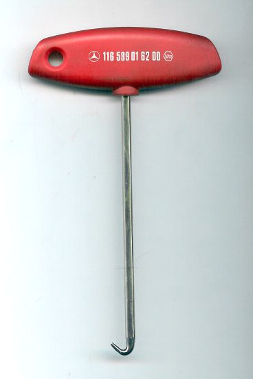 Die starken Federn für die Bremsbacken lassen sich leicht mit einem kräftigen Haken aus- und einhängen. Sehr praktisch ist das Mercedes-Werkzeug W116589016200. |