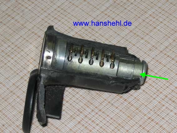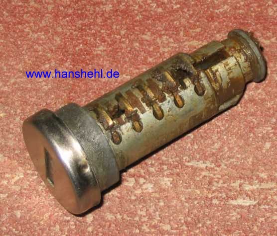 | Dies wird bei den vier anderen Schließungen auch durchgeführt. Der Schließzylinder wird dann gut gefettet und wieder eingedrückt. Das Loch habe ich offen gelassen, da es der Tankdeckel mit Entlüftung beim Diesel war. Man kann auch ein M5 Gewinde einscheiden (Bohrung 4,2 mm) und mit einer kurzen Schraube M5 verschließen. Die kleinen Federchen gab es übrigens bei VW als Ersatzteil. |
