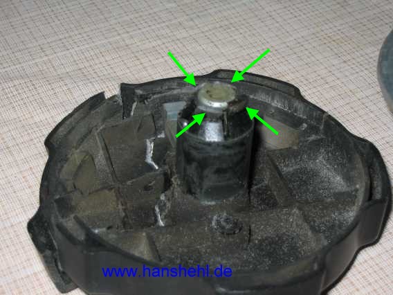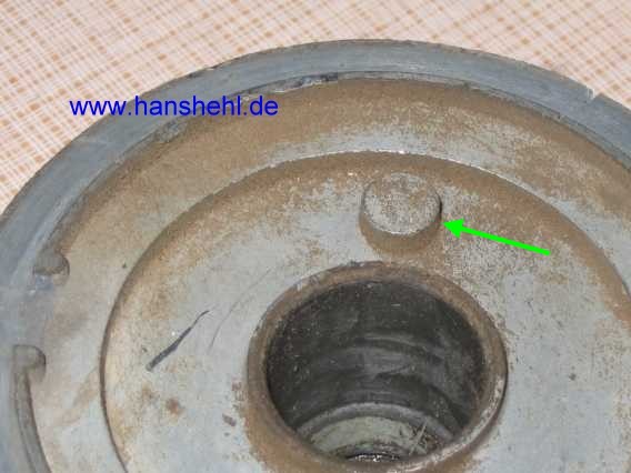 Der innere Aufbau des Tankdeckels war nicht dokumentiert. So könnte man ja die Schließung abändern (siehe Tipp Schließzylinder Lenkschloss und Tür). Von Steffen (viermalvier.de Forum Mercedes) erhielt ich am 26.02.2007 einen Tankdeckel zum Zerlegen (Vielen Dank!). Es ist ein Deckel ohne Entlüftungsbohrung (grüner Pfeil). |