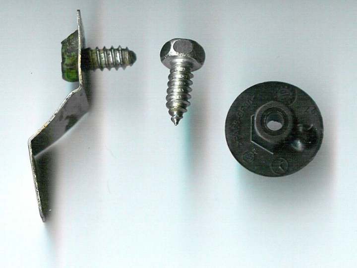 Die Befestigungswinkel muß man selber bauen und im Kotflügel und an der Karosserie anschrauben. Wie man die Winkel macht, ist egal, ich habe die Plastikschraubkappen vom 260 E (Innenkotflügel) genommen. Die passten dann auf dicke Sechskantblechschrauben, die ich an die Winkel mit dem Kopf schweißte. Es genügen 4 - 5 Winkel. Der Einbau war die beste Lösung gegen Rost. |