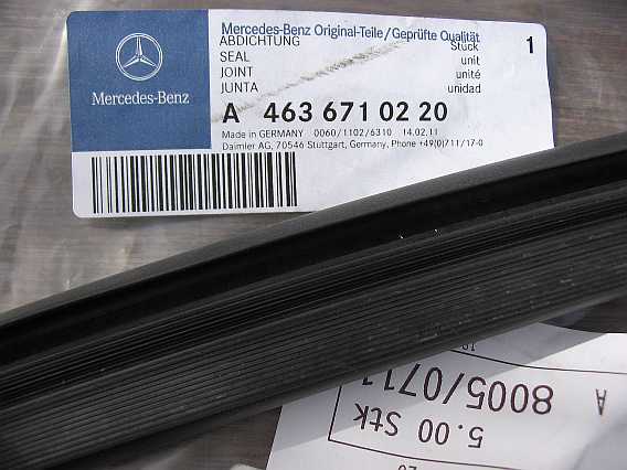 Gummidichtung Scheibe 460/ 240GD: A4606710320 Wie die an der unteren Kante verrosteten Scheibenrahmen zeigen, dichtet das Profil nicht so gut ab. Die Gummidichtung Scheibe für 463, z.B. G55AMG: A4636710220 ist aus EPDM (Ethylen-Propylen-Dien-Kautschuk) gefertigt und passt auch beim 460 / 240GD. Ausführlicher Bericht siehe tipp20a.htm#b4 ( Windschutzscheibe 463). |
