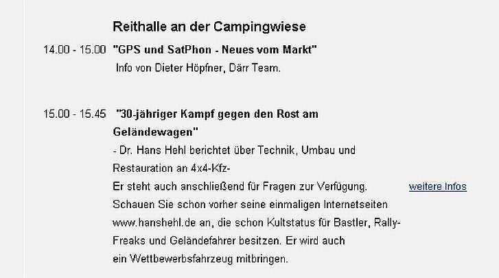 Beim Globetrotter-Treffen im Juni 2011 hielt ich am Freitag, 24.06.2011 von 15-16 Uhr den Bilder-Vortrag: 30 Jahre Kampf gegen den Rost am Geländewagen. Die große Reithalle war fast voll, also haben viele das gleiche Problem ;). Bilder zum Vortrag 2011 sind hier. |