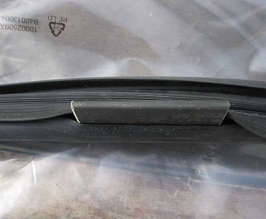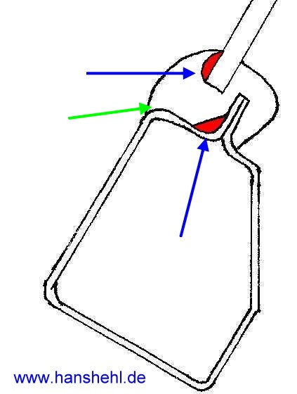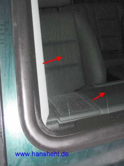 Nicht im WIS: Es empfiehlt sich auch den Hohlraum unter der umlaufenden äußeren Gummilippe dünn mit Kleber aufzufüllen (grüner Pfeil), um so eine bessere, zusätzliche Abdichtung am Scheibenrahmen zu erzielen. Dadurch wird auch verhindert, dass der Weichmacher aus dem Scheibengummi den Lack angreift. |