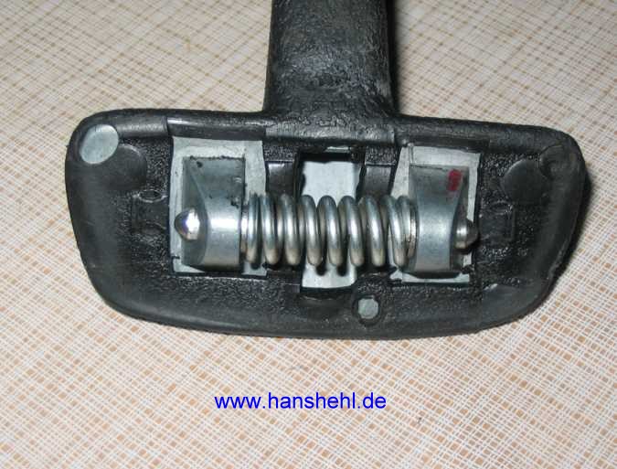 Seit 1979 ist bis 2006 die Befestigung des Innenspiegels (Bilder 240GD) gleich geblieben: Eine starke Feder drückt die zwei Bolzen nach außen in die Halterung, siehe Bild vom 240GD (10/1979). Etwas Fett an den seitlichen Bolzen und am Rahmen erleichtert die Montage. |