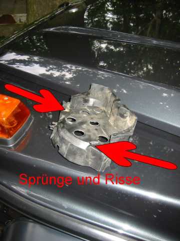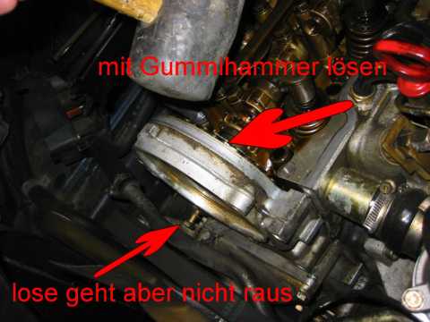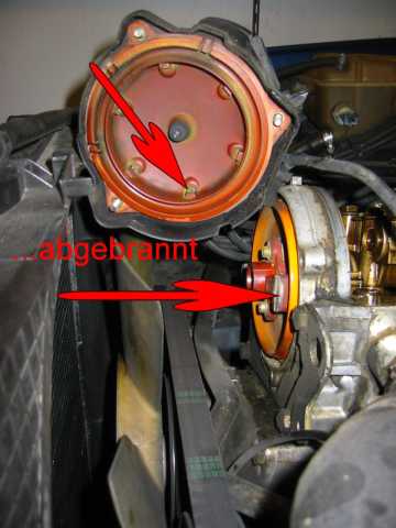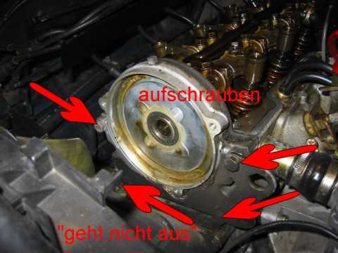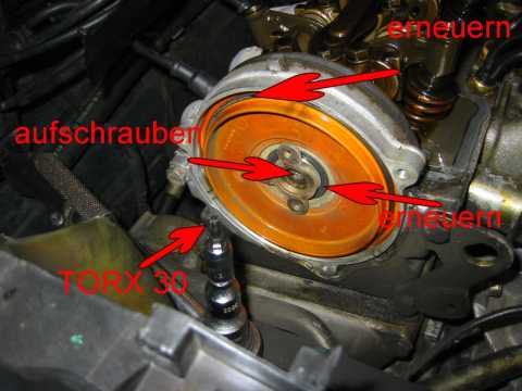 Mit 4mm "Spezialimbus" untere Schraube lösen. (Bild) (Schraube kann nicht herausfallen wenn locker) Obere 2 Schrauben öffnen und Verteilerdeckel abnehmen. Die 3 Schrauben am Verteilerfinger lösen und Finger abziehen (ggf. erneuern da abgebrannt) (Bild) Mit 30er Torx zentrale Schraube lösen und Verteilerfingerhalterung abziehen. (soll manchmal schwergängig sein, dann ggf. mit 3 Schrauben "abdrücken" und vorsichtig mit Hammer lockern) Gelbe / orange Scheibe abnehmen reinigen und O-Ring Dichtung erneuern (i. d. R. "steinhart"). Die vier M10 Schrauben lösen und Deckel vorsichtig mit Gummihammer lösen. Schraube unten rechts in Fahrtrichtung lässt sich wegen der Kühlerwasserleitung nicht entfernen mit Deckel zusammen herausnehmen. Deckel reinigen und insbesondere die alten (Silikon-) Dichtungsreste sorgfältig entfernen. Alten Simmerring (Nockenwelle) entfernen. Alte Gummilippe entfernen und ebenfalls sehr sorgfältig die Dichtungsreste entfernen (Oberfläche nicht zerkratzen) Staubsauger verwenden damit keine Teile in den Kasten der Steuerkette fallen. Dichtungslippe mit Hylomar bestreichen und einsetzen. Alle übrigen Dichtflächen insbesondere die Ecken ausreichend mit Hylomar bestreichen. Deckel mit eingesetzter Schraube unten rechts mit Gefühl einpassen (Dichtlippe nicht beschädigen oder verschieben). Die 4 Schrauben gut anziehen. (Dichtmasse quillt leicht nach außen). Simmerring mit etwas Öl bestreichen und mit Hilfe des Daumennagels über die Welle schieben. Mit Gefühl und einer großen Nuss weiter über die Welle schieben bis plan mit der Oberfläche des Deckels. (Achtung nicht zu weit schieben da kein Anschlag). Gelb / orange Scheibe mit neuer O-Ringdichtung einlegen. Verteilerfingerhalterung mit zentraler Torx Schraube befestigen. Verteilerfinger (neu) mit den 3 Schrauben befestigen. Verteilerdeckel (neu) mit Schutzkappe mit den 3 Schrauben einbauen. Zündkabel gem. Nummerierung aufstecken. Ventildeckel aufsetzen und festschrauben, Unterdruckleitungen nicht vergessen. Zündverteiler Abdeckung montieren,Motor starten und Probfahrt machen, "Bermudadreieck" auf Dichtheit prüfen. Anmerkung: Mit neuem Verteiler / Finger wesentlich ruhigerer Leerlauf. |
