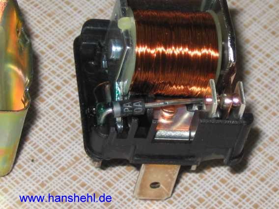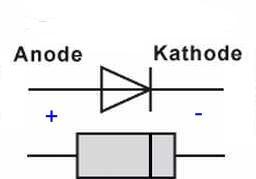 Die Diode (ein Halbleiter) wird in Schaltplänen mit einem Symbol gekennzeichnet, das die Richtung des technischen Stromflußes anzeigt. Meistens ist nur ein Ring auf der Diode zu sehen, der dem senkrechten Strich des "K" entspricht. Die Diode sperrt den Stromfluß in der anderen Richtung. In der Relaisspule entstehen beim Abschalten hohe Induktionsspannungen, die die vorgeschaltete Elektronik zerstören können. Eine in Sperrrichtung parallel zur Magnetspule geschaltete Freilauf-Diode unterbindet dies, siehe auch Elektronikkompendium, dort: Halbleiterdioden). |