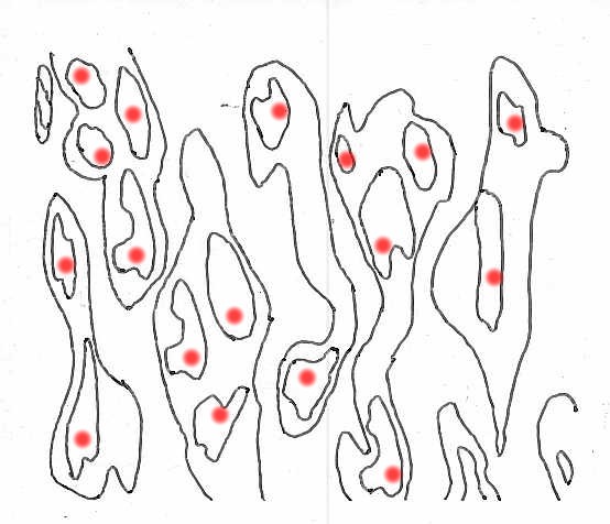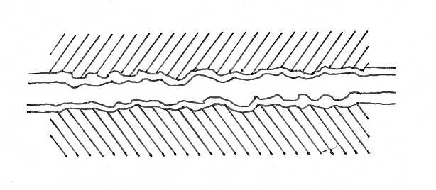 Die elektrisch wirksame Fläche beträgt nur noch 0,01 bis 1 % der Kontaktfläche, im 2. Bild als rote Punkte markiert. Hinzu kommen Fremdschichten wie Oxidschichten oder Abdampfungen der Isolierstoffe, die durchbrochen werden müssen und höherohmig sind (Bilder nachgezeichnet). |