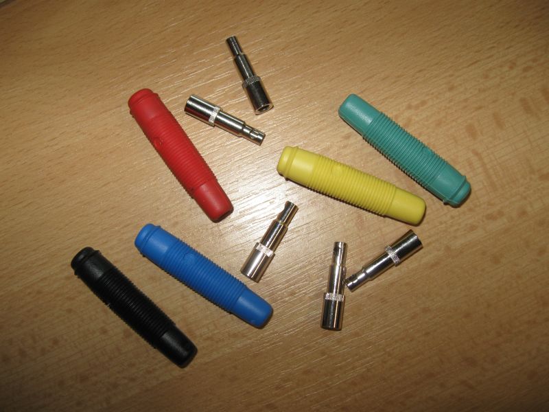 Die 4,0 mm Buchsen und Stecker gibt es bei (Fa. Reichelt,Hirschmann-Buchsen, aus Messing verzinnt, z.B. KUN 30 GE oder vergoldet KU 30 AU GE (Durchgangswiderstand 3 mOhm) mit Lötanschluss bis 2,5 mm2. |