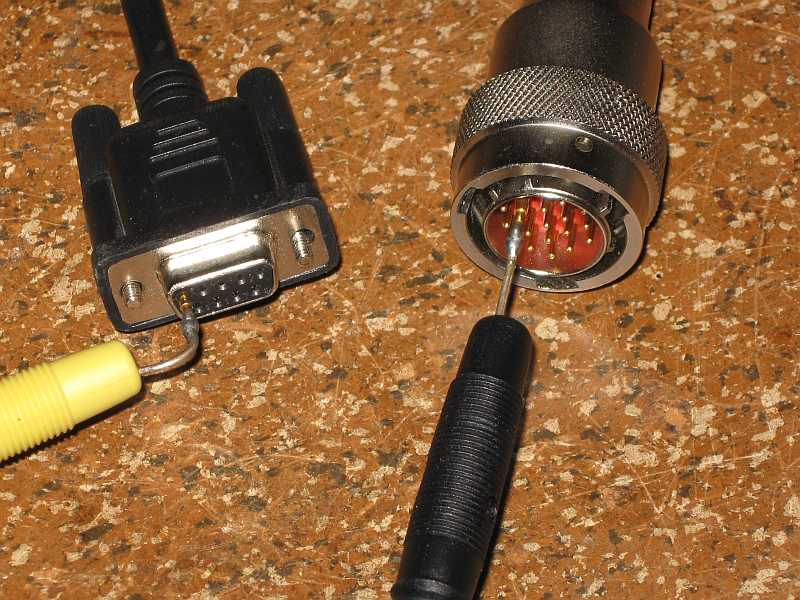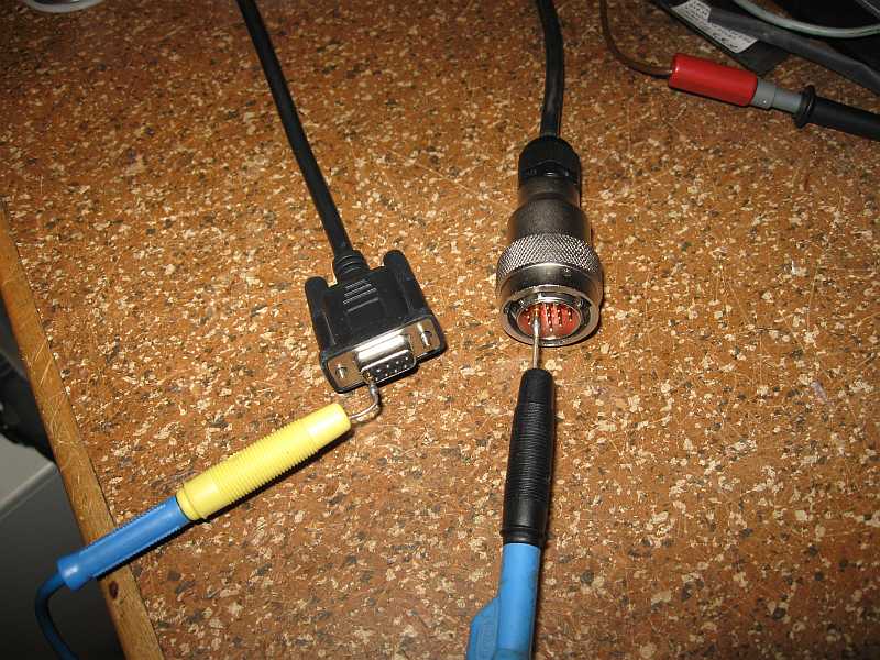 Aus den Stecker- und Buchseneinsätzen alter Sub-D-Buchsen bzw. Stecker habe ich mir Messadapter zum Anstecken am 19-poligen Rundstecker und an der SUB-D9-Buchse des RS232-Kabels gebaut. Mit einem Ohmmeter wird nun die Belegung des RS232-Kabels ermittelt. |