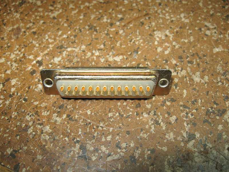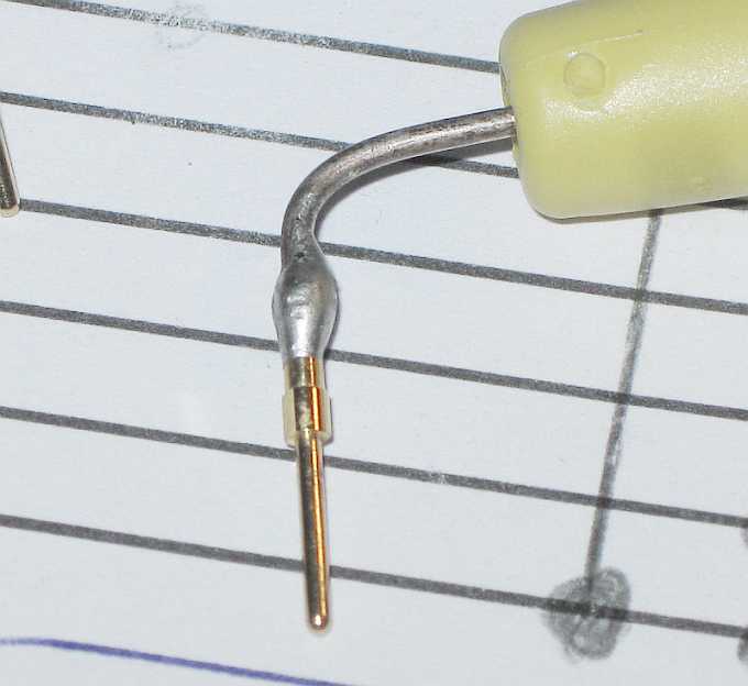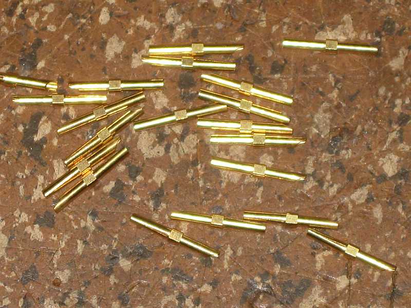 Die vergoldeten Buchsenpins aus der Sub-D25-Buchse sind gut geeignet. Sie sind auf einer Seite geschlitzt und auf der anderen Seite befindet sich eine Bohrung für die Kabelader zum Anlöten. |