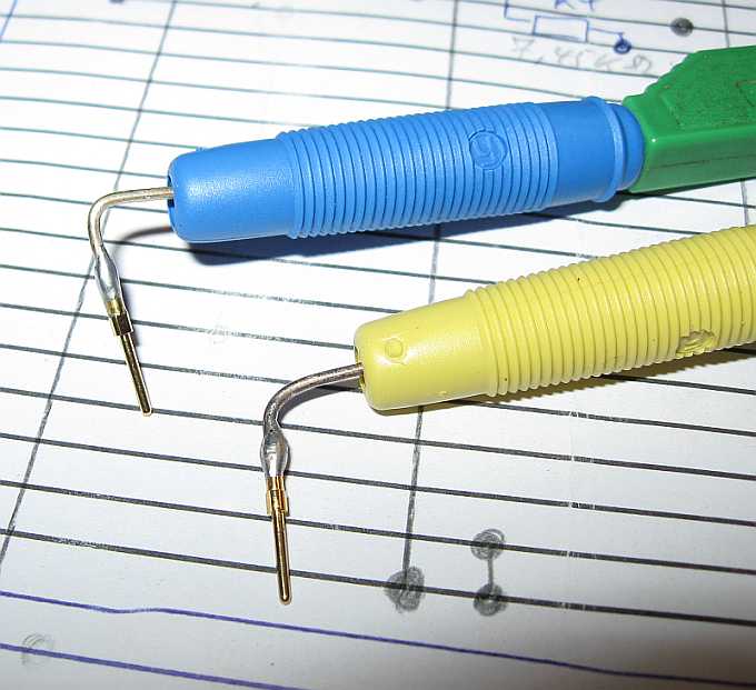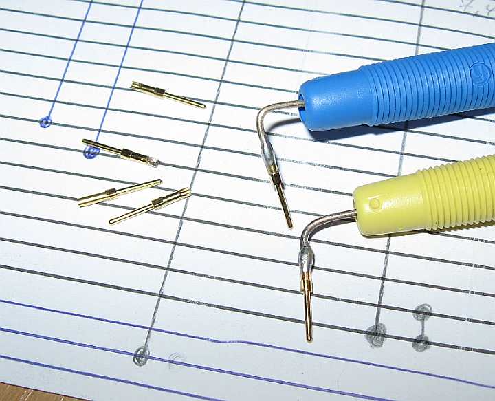 Um die Verschaltung eines Testadapters für eine Diagnose zu ermitteln, baute ich mir aus vergoldeten Pins eines alten SUB-D25-Steckers und 4,0 mm Hirschmann-Kupplungen (Bananenbuchsen) zwei Steckadapter. Mittels Ohmmeter können die Schaltung und die Widerstandswerte der SMD-Widerstände im Testadapter ermittelt werden. |
