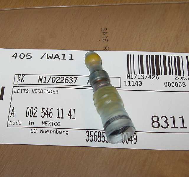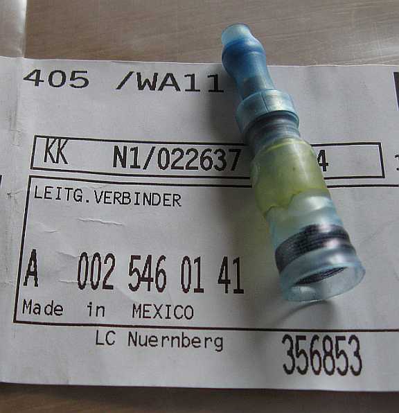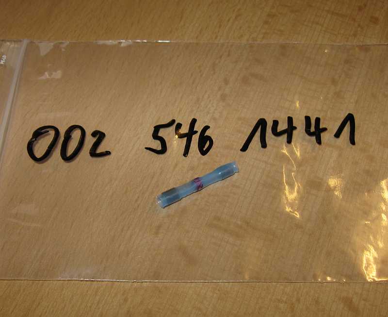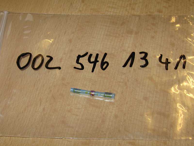 Die Preise der Lötverbinder sind eigentlich zu hoch. Eine genausogute Methode kann mit Aderendhülsen erreicht werden. Das abisolierte (15 mm) Litzenende zusammendrehen. In eine passende lange Aderendhülse von beiden Seiten ein Litzenende einschieben, die Hülse verpressen und verlöten. Mit selbstvulkanisierendem Isolierband die Reparaturstelle umwickeln und darüber das vorher aufgeschobene Schrumpfschlauchstück mit dem Heißluftfön aufschrumpfen. Lötendhülsen: Nr. 370, EPC-Net, 54, Untergruppe 19, Bilder 1-3, die Untergruppe gibt es nicht bei allen Typklassen, aber z.B. beim 204.048 C200CGI. |