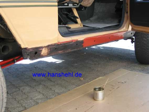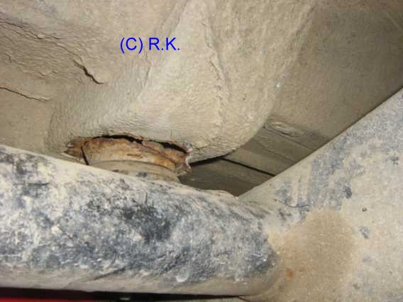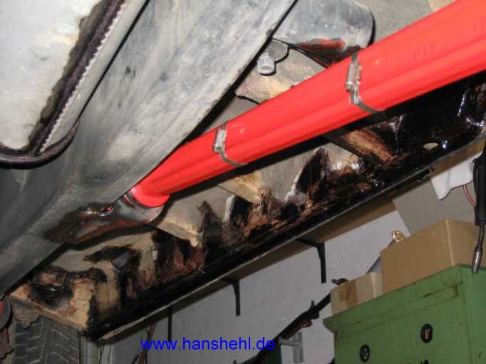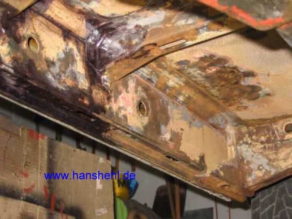 Schaut man sich nach einigen Jahren mal wieder die Unterseite genauer an, entdeckt man braune Stellen im originalen am Unterbodenschutz. Mit einem stabilen Messer oder mit einem alten Stemmeisen legt man die Rostfläche frei. Ursache ist die Versprödung und Rissbildung des Kunststoffmaterials. Darunter rostet das Blech weg. Am Besten entfernt man den alten Belag ganz. |