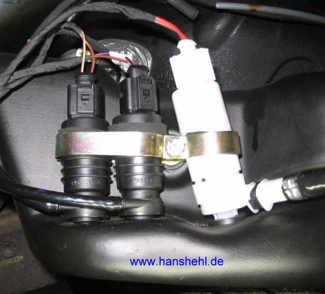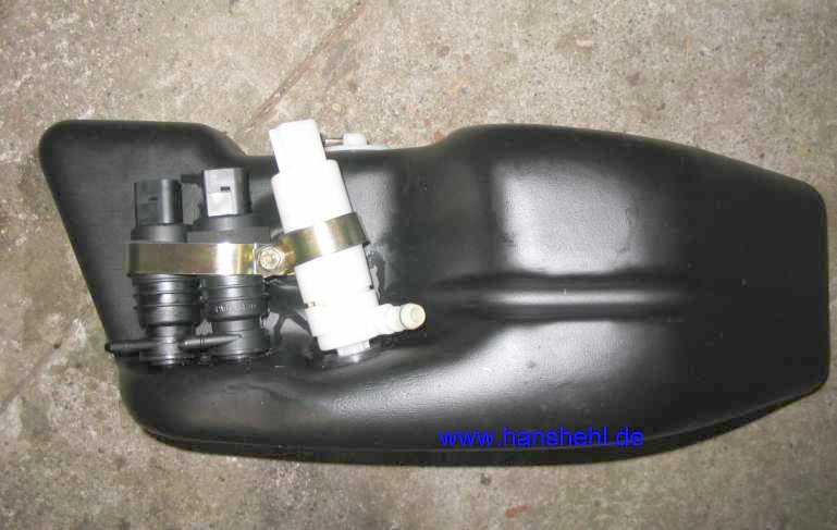 Die weiße Pumpe M5/2 mit weißem Stecker bedient die Scheinwerferreinigungsanlage (SRA). Schaltplan: PE82.15-P-2000-99GA, Legende: PE82.15-P-2000-60GA) Die Pumpe wird vom Steuergerät SAM (vorne) N10/1 direkt mit + 12V angesteuert (rot/grau und braun, 1,5 mm2). Eingeschaltet wird sie mit dem Taster S1s7 im Lichtschaltermodul S1 (links neben dem Lenkrad, das direkt mit dem SAM vorne N10/1 verbunden ist. Es gibt keine Sicherung (ist aber elektronisch abgesichert). |