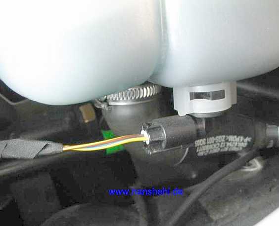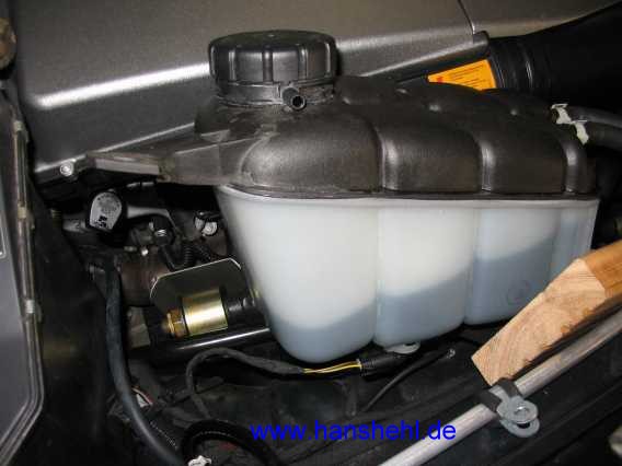Unter dem Kühlmittelausgleichbehälter ist ein zweipoliger MQS-Stecker, 0,75 mm2, C-Codierung, siehe Tipp 66 , zur Kontrolle des Flüssigkeitsstandes. |