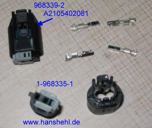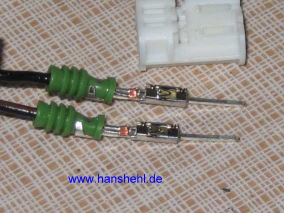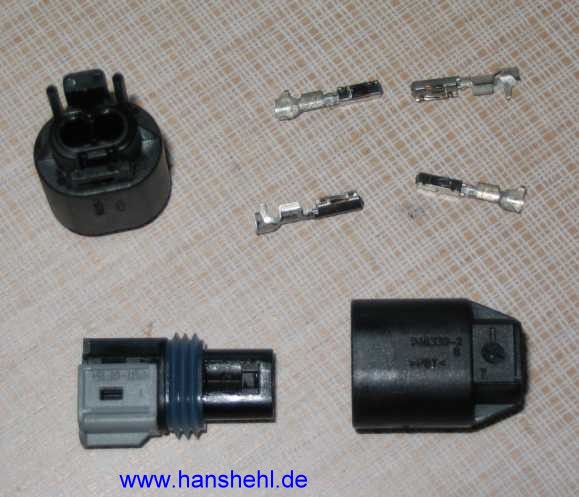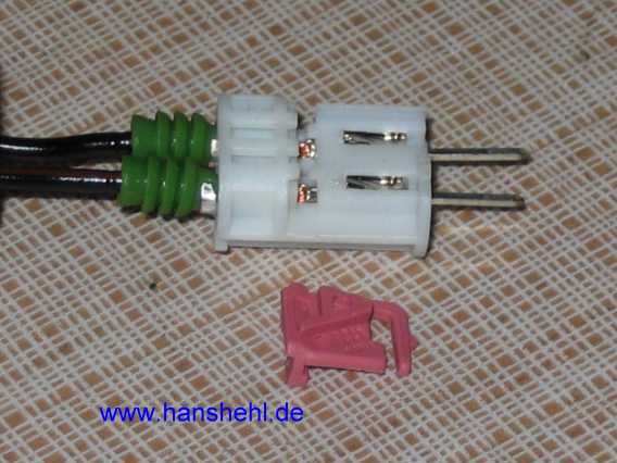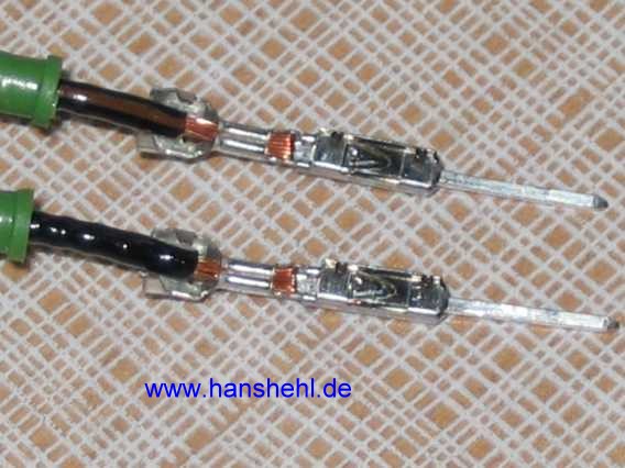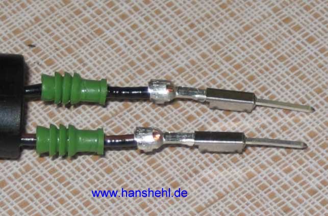 Die Steckergegenstücke sind teuer und eigentlich ist das Ganze eine unmögliche Konstruktion. Es ist das Micro-Quadlock-System (MQS, GF00.10-P-7000A) mit Kontaktstift und Kontakt-Buchse für 0,75 mm². Im Tipp66 (Stecker) sind weitere spezielle Stecker beschrieben. |
