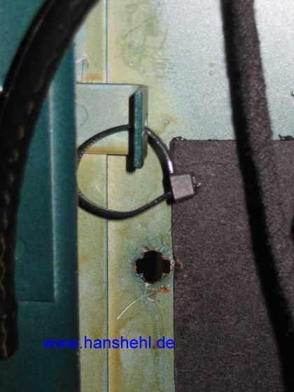 ![]() siehe auch Tipp Hecktür tipp6a2.htm: Der Ausschnitt für die Düse an der Hecktür sollte gut mit Wachs konserviert werden. Ein Rückschlagventil A0008601062 ist mit einem Kabelbinder am Winkel befestigt. Zum Ausbau den linken Kantenschutz am Türrahmen abziehen, die Verkleidung abziehen, dabei die Lautsprecherstecker-Kupplung trennen (siehe Steckdose). |