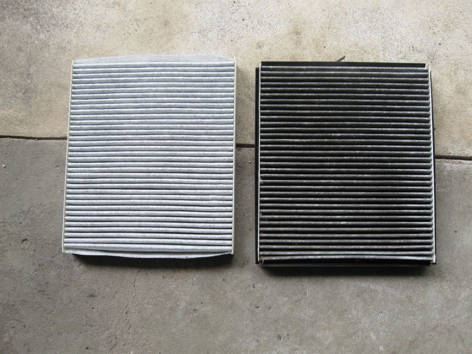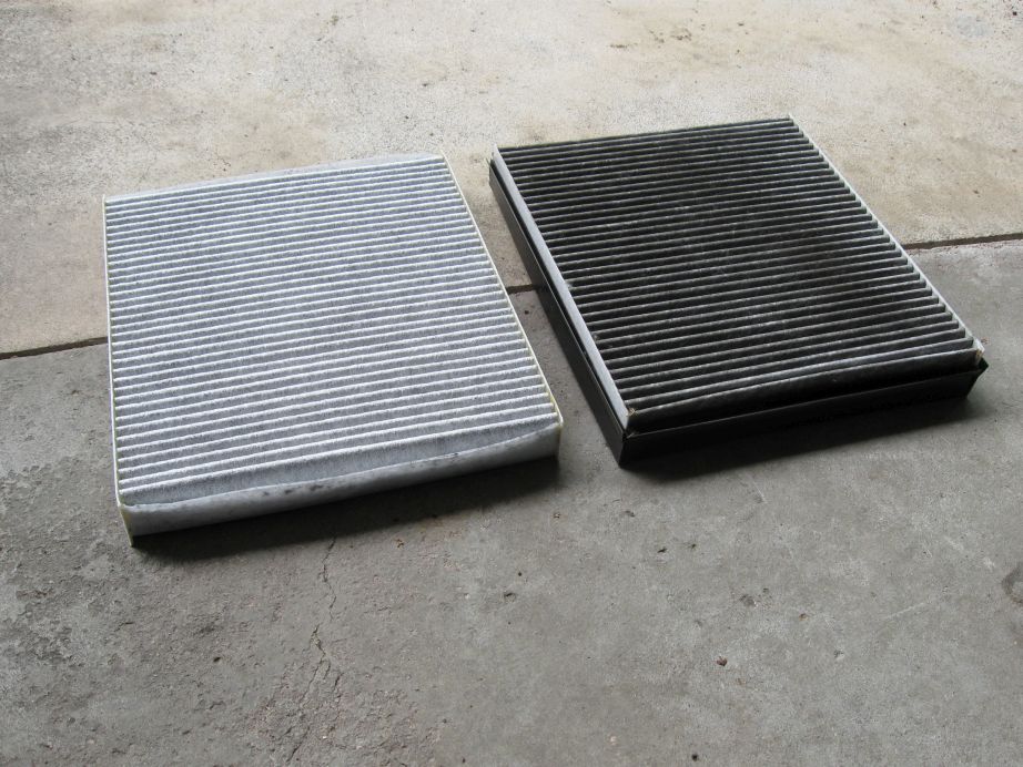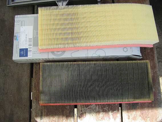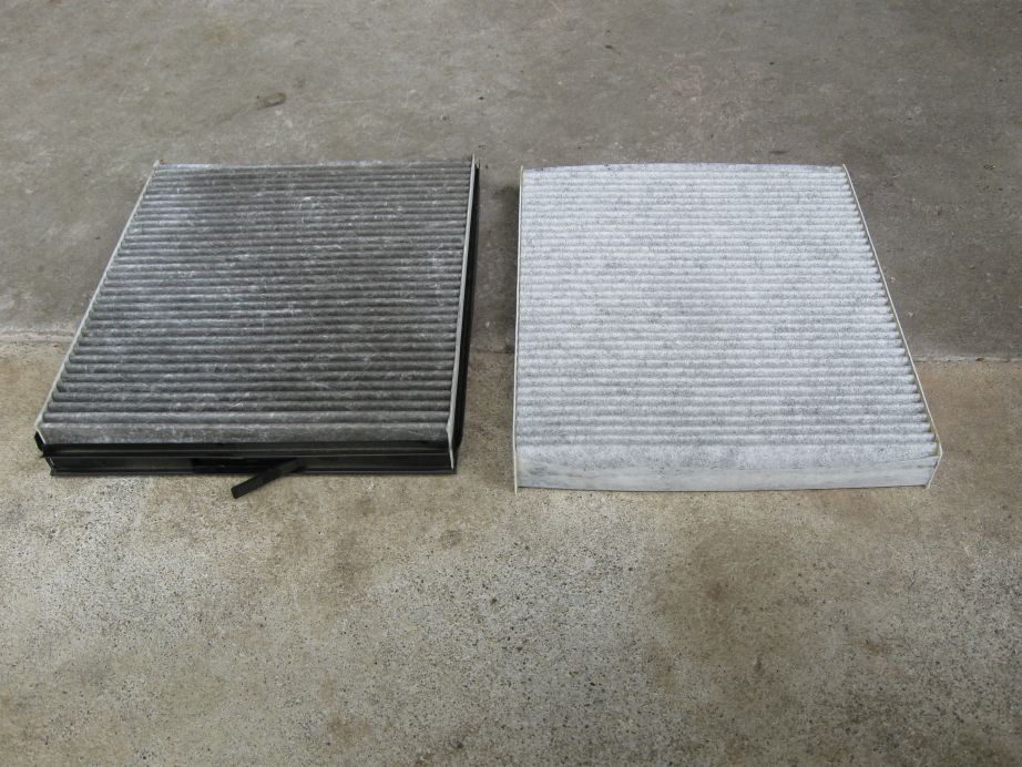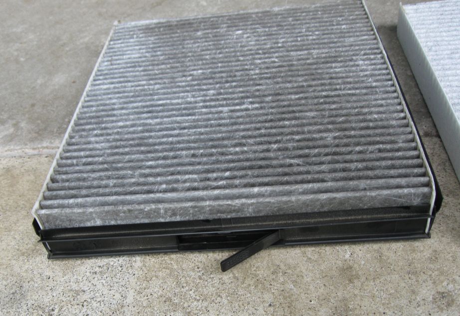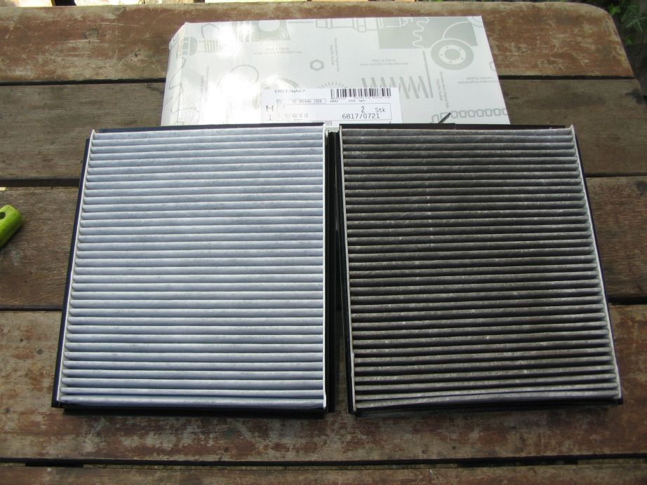 Nach über 53.000 km und zwei Jahren zeigt der Filter schon deutliche Gebrauchspuren. Ein neuer Filter A4638300018 ist auf der Lufteintrittsseite hell und auf der Rückseite durch die innere Aktivkohleschicht dunkler. Bei der Firma W+S Autoteile GmbH gibt es den gleichen Innenraum-Filter, der z.B. auch beim VW Fox Polo verbaut ist. Allerdings ist es nur der Filtereinsatz ohne den Plastikrahmen. Die Einsätze kann man aber wechseln, aber beim Einsetzen auf den Pfeil der Ansaugrichtung (nach innen) auf der Filterkante achten. |