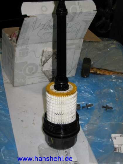 | Nach Lösen der 6 Torx-Schrauben (Torx 25) am Metalldeckel vom Filterkasten kann man den Filter entnehmen. | ![]() |