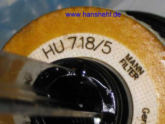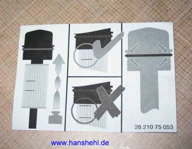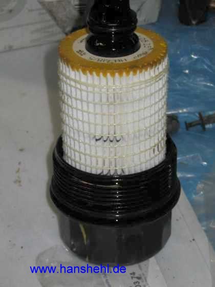Der Filtereinsatz wird drehend kräftig soweit auf die Mittelstange vom Schraubdeckel aufgedrückt, bis die untere Markierung nicht mehr sichtbar ist (siehe Beipackzettel und AP18.00-P-0101-06GH. Den großen O-Ring einölen und den Filter nur handfest (25 - 28 Nm) anziehen. |