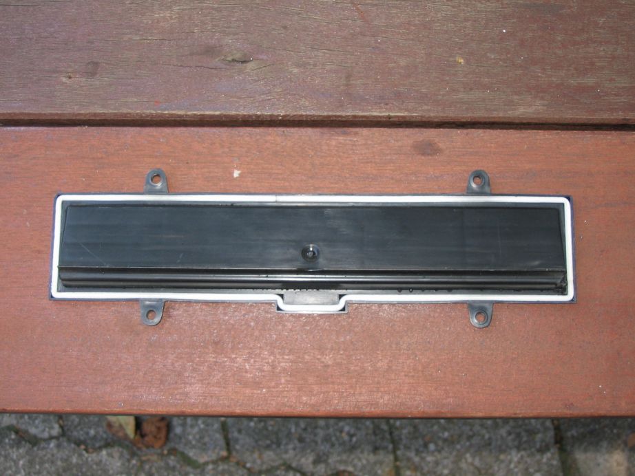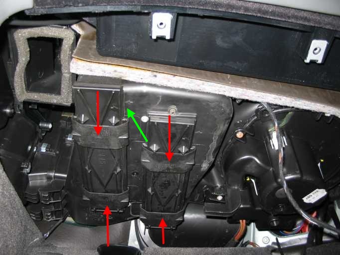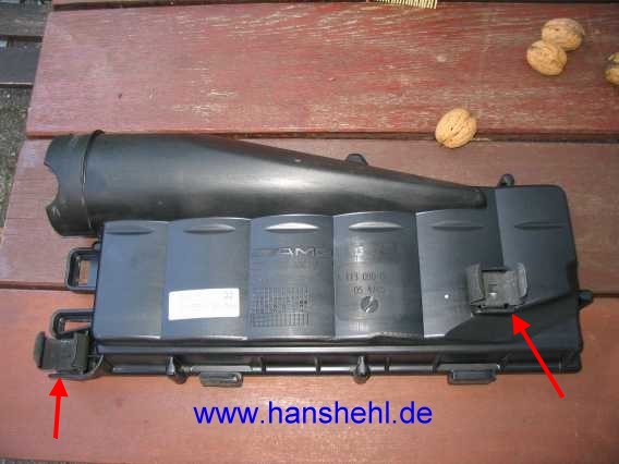 | Das Filterkastenunterteil A1130900501 ist aus Kunststoff, das Oberteil aus Metall. Auf der Unterseite sieht man die zwei Klammern (rote Pfeile). | ![]() |