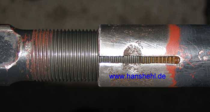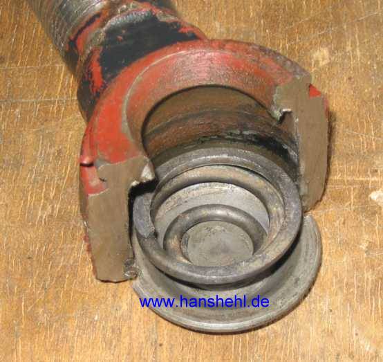 Da habe ich mal ein altes Gelenkstück aufgeschnitten! Es bestand aus 8 Teilen. Am rostigen Kugelzapfen sieht man, dass die Schmierung nicht über Jahrzehnte ausreicht, besonders wenn anscheinend die Staubmanschette einen Riß hatte. In den Bodendeckel könnte man einen Schmiernippel einbauen, so wie es früher mal war! siehe auch Lenkstangenkopf 280GE. |