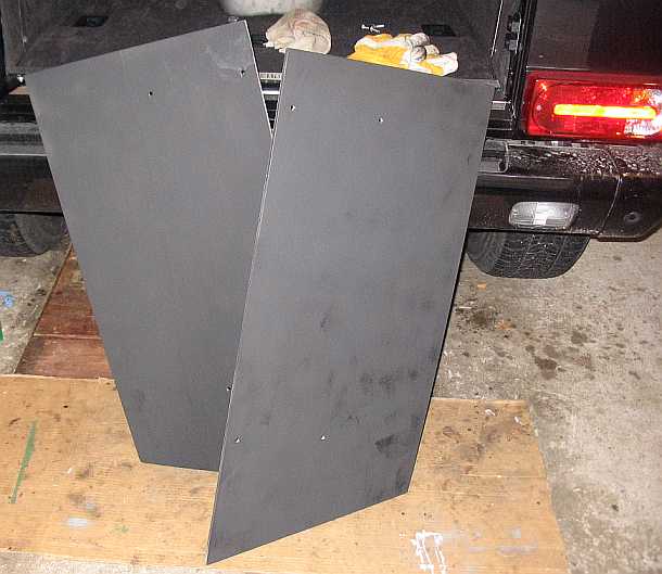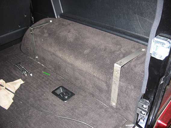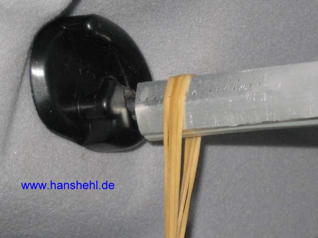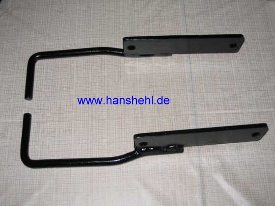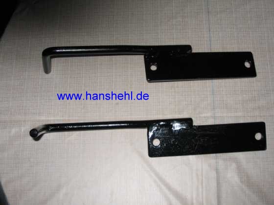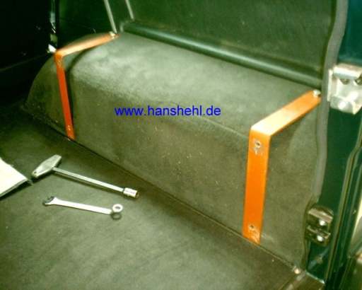 Die Flacheisen werden so gebogen und gebohrt, dass unten die Originalbefestigungen der Zurrösen verwendet werden können. Nach Ausbau der Innenkotflügel werden oben am Radlauf die Löcher gebohrt, entgratet, konserviert und die Winkel an der Radkastenoberseite angeschraubt. Mit einem 8mm Loch-Stanzeisen kann man vor dem Bohren die Löcher aus dem Teppichboden ausstanzen. |
