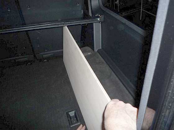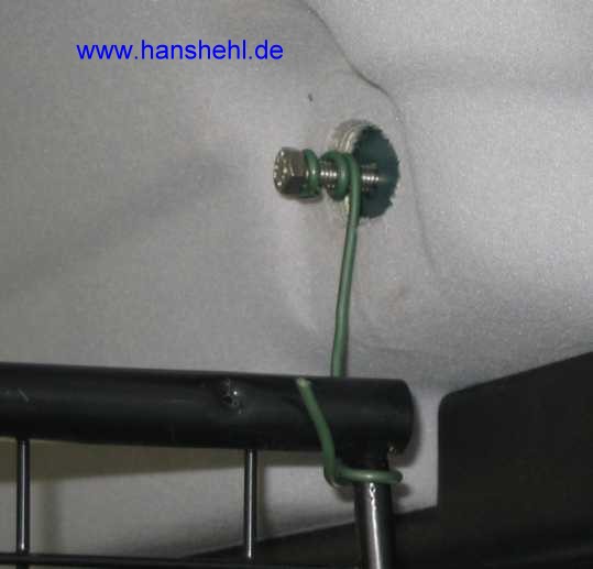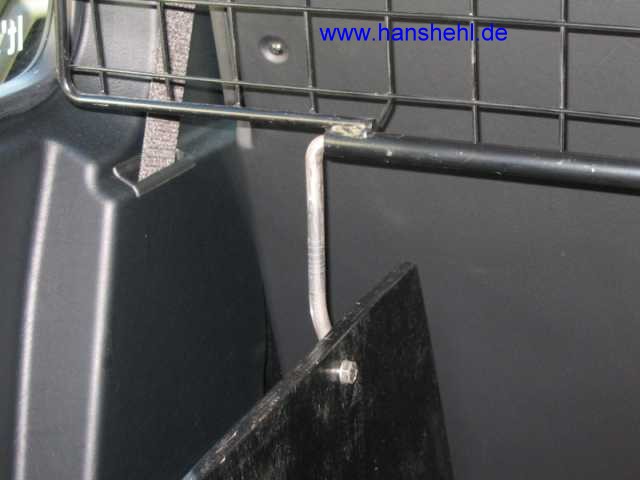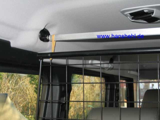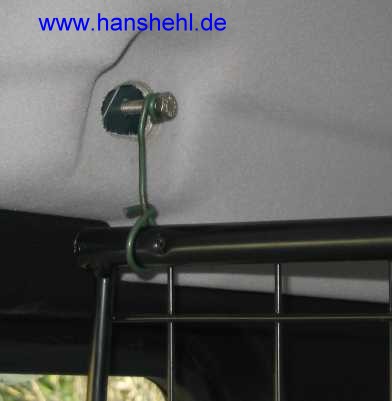 Im neuen 463 (2/2006) sind an der Decke Befestigungslaschen für ein Lastschutznetz vorhanden. Da kann nun das Hundegitter angebracht werden. Die Laschen werden mit einem Inbusschlüssel abgeschraubt und zum Ausmessen das Gitter mal provisorisch mit Draht und zwei Schrauben befestigt. |