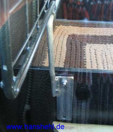 Unten stützt sich das Gitter auf zwei gebogene 10 mm Rundeisen, die mit einer angeschweißten Platte an der Wand der Stauboxen angeschraubt sind. |