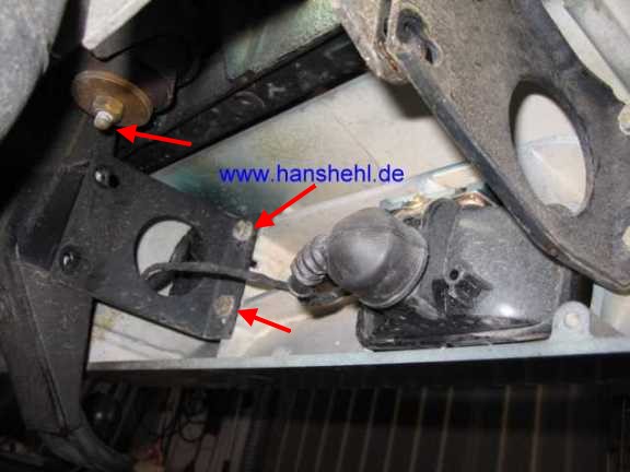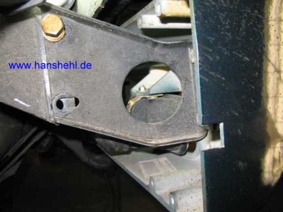 | Es lohnt sich die Stoßstangenkappe abzunehmen und den Nebelscheinwerfer sowie den Innenkotflügel auszubauen. Alle Kanten werden konserviert und alle Schrauben durch V2A-Schrauben ersetzt. Die Kunststoffkappe wird ohne Metallklammer an der Nase aufgeschoben (roter Pfeil = Nut), sie hält so auch fest und es kann nichts rosten. | ![]() |