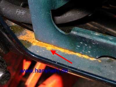 | Der braune Belag im ersten Bild (roter Pfeil) ist übrigens der Rost der Bohrspäne, die nach dem Bohren der Befestigungslöcher für den Frontbügel (siehe oben, Firmeneinbau!) nicht entfernt wurden. | ![]() |