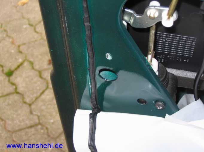 Alles mit Unterbodenschutzwachs behandeln. Auch die Auflagefläche der Spiegeldichtung an der Türwand und der äußere Spiegelfußrand werden mit Wachs bestrichen, ebenso die Türfläche innen. |
