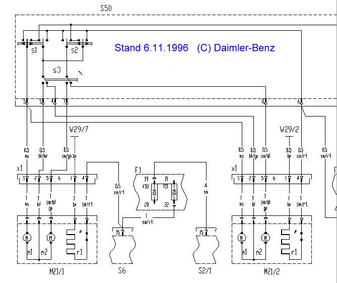 Spiegelheizung: braun (Masse) und schwarz/rot: Thermoschalter: Elmwood 25015000 ("Knackfrosch") Spiegelmotoren: ca. 70 mA Motor M1: blau und weiß Motor M2: blau und schwarzblaugrün Schaltplan für die Anschlüsse des 463-Außenspiegels: WIS: PE88.79-P-2000-99H, Legende PE88.79-P-2000-60H (Bild siehe oben) |
