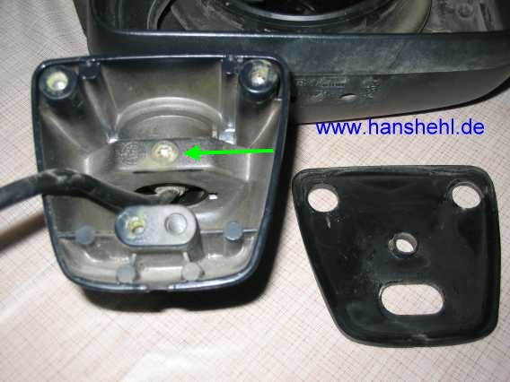 Nach Lösen der Torx-Schraube (TX25, grüner Pfeil) kann der Spiegelfuß (notfalls mit Plastikhammer vorsichtig nachhelfen) vom Unterteil abgezogen werden. |
