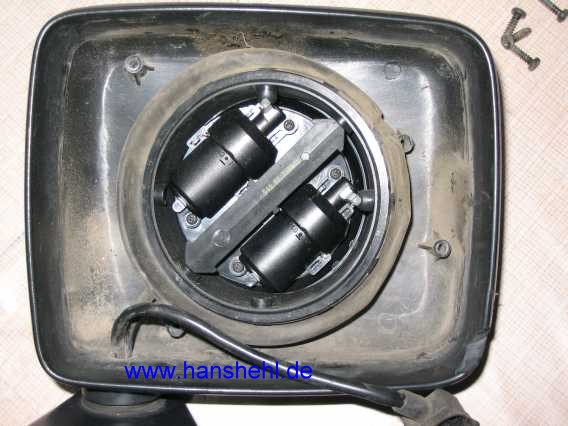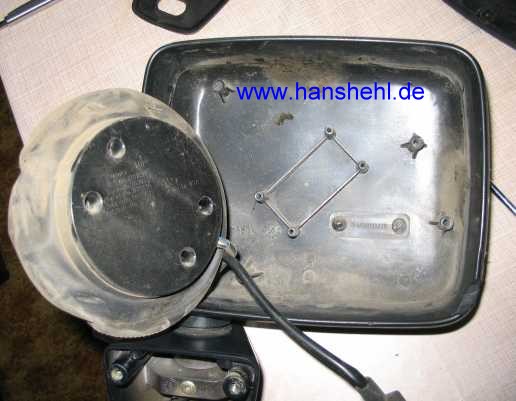 Auch die elektrische Verstellung (Schalter vom Pkw, roter Pfeil im Bild) und Spiegelheizung (Relais mit Schalter) lassen sich nachträglich einbauen. Der Schalter wirkt wie ein Joy-Stick für die horizontale und vertikale Verstellung des Spiegels. Durch Drehen des Knopfes wird zwischen linkem und rechtem Spiegel umgeschaltet (Hinweis von DaPo, viermalvier-Forum). Eigentlich könnte man den Schalter mit Relais für die Spiegelheizung weglassen und diese über eine Sicherung direkt an Kl. 15 anschliessen (DC-Lösung). Das beheizte Spiegelglas wird durch einen Temperaturschalter gesteuert, der ab 25 Grad öffnet und so die Spiegelheizung ausschaltet. Die Heizfolie hat einen Widerstand von etwa 4,7 Ohm, da fließen auch nur max. 2,8 A bei 13 V. |