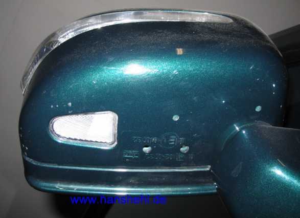 ![]() Dieser Spiegel besitzt noch nicht die Vorfeldbeleuchtung. Der Zusatzblinker (hier in farblos) ist noch an der Seite angebaut (seit 1979 gleiche Bauweise wie beim 240GD, siehe hier. |