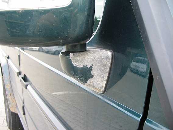 Auch beim G55AMG (2/2006) ist im Oktober 2007 diese Korrosion im Spiegelfuß vorhanden. Die weißen Oxidschichten auf dem Aluminium kann man abkratzen oder abschleifen. |