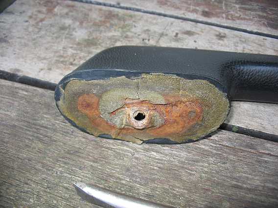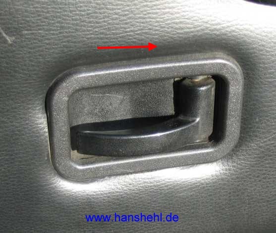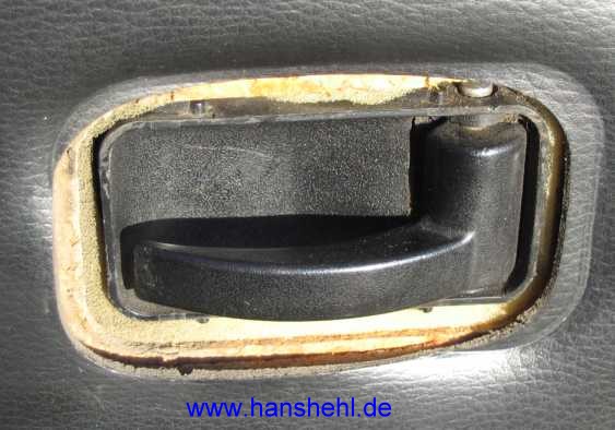 | Auch der rote Riegel der Türinnenverriegelung wird abgeschraubt, ohne die Abstandsscheibchen zu verlieren. Diese verhindern ein Schleifen an der Verkleidung. | ![]() |
