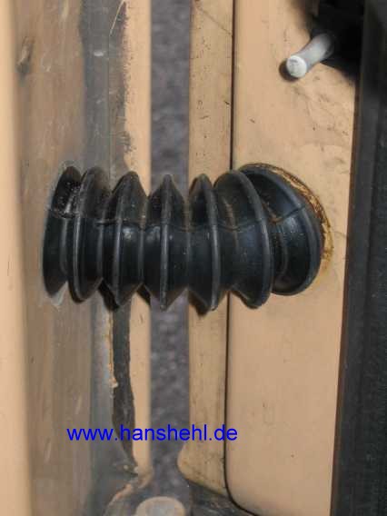 | Die Lautsprecherleitung wird durch einen runden Gummibalg A1268210297 (eckige Form beim G55AMG A4638210197) geführt. Dazu müssen zwei größere Löcher in die Türschmalseite und den Türrahmen (A-Säule) gefräst werden. Bei der Austauschtür des 280GE ist das 24 mm große Loch schon vorhanden. | ![]() |