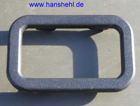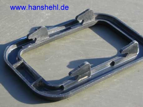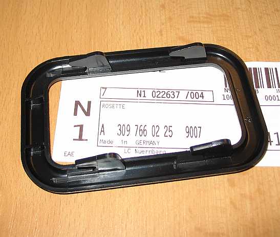 | Der Rahmen (Rosette A3097660225) wird vorsichtig in Pfeilrichtung verschoben, damit die vier Haken frei werden und abgenommen. Er ist bei der Hecktür des G55AMG noch vorhanden. | ![]() |