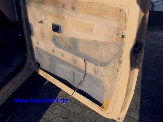 | Eine feste Polyethylenfolie (Baumarkt) schützt die Holzplatte vor eindringender Nässe über die Fensterführungen. Verwendet man einen normalen Kleber wie z.B. Pattex, dann kann man die Folie abziehen und wieder andrücken. Beim Trophy-280GE habe ich beim Einbau der Türverkleidung diese Folie eingebaut. Auch beim 463, z.B. Fahrertür G55AMG ist die Türfolie eingebaut. | ![]() |