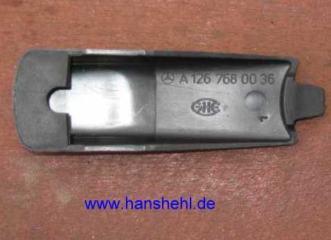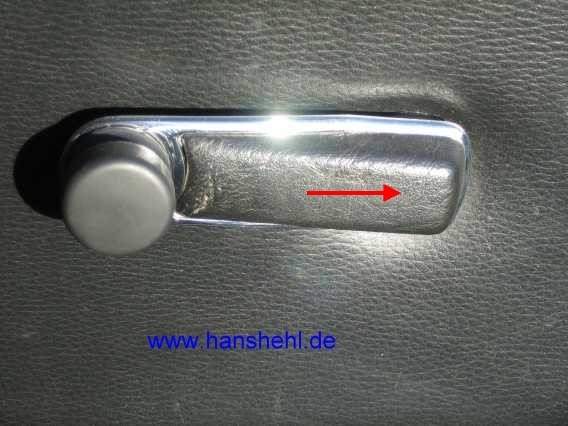 | Zum Ausbau der Fensterkurbel wird die Kunststoffeinlage A1267680036 in Pfeilrichtung abgezogen. Die halbrunde Aussparung hält die Kurbel in der Nut der Achse. | ![]() |