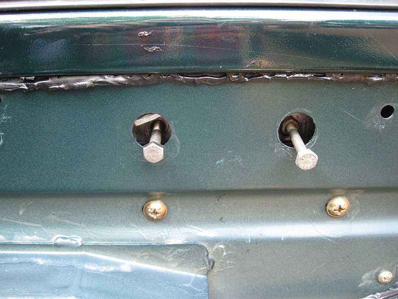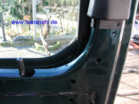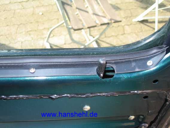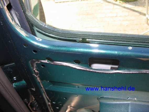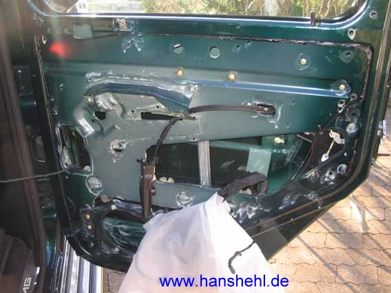 Nach dem Abtrennen der weißen Wasserschutzfolie zeigt sich, dass an den Blechteilen in der Tür keine Konservierung vorgenommen wurde. Also alles gut mit Wachs einsprühen, auch die Türunterseite mit den Wasserablaufschlitzen. Die Folie wird dann wieder sorgfältig auf die schwarze Dichtungsmasse am Türblech gedrückt. |