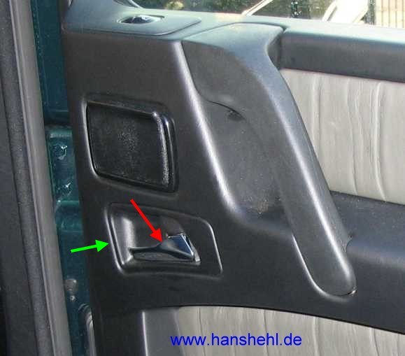 Mit einem Kunststoffkeil drückt man den Rand (grüner Pfeil) des Türöffners hoch und zieht den Öffner nach vorne aus der Verkleidung heraus. Es ist nun einfacher, den Türöffner durch die rechteckige Öffnung zurück zu schieben als den Seilzug auszuhängen. Dann noch den Stecker vom Fenster-Schalter abziehen (gelbe Pfeile). |