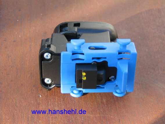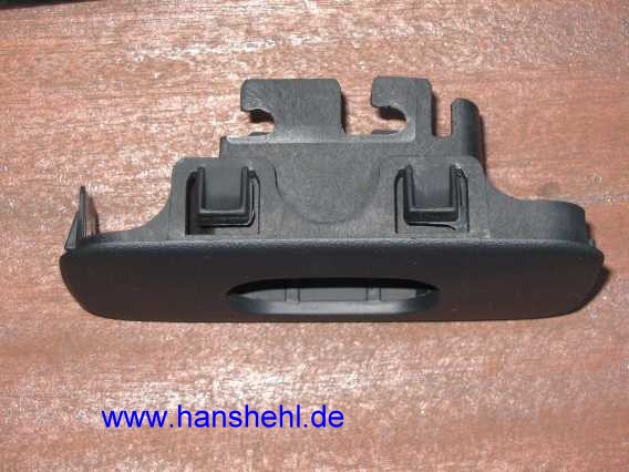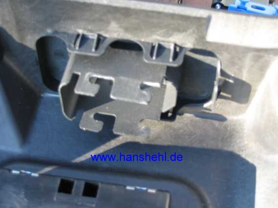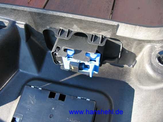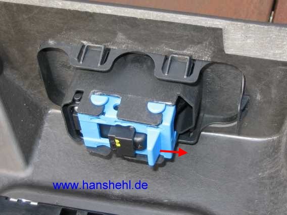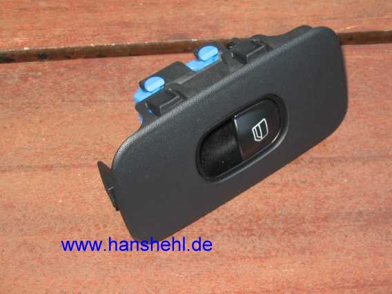 Die Schalter sind an den Fondtüren und an der Beifahrertür gleich. Man kann nach dem Lösen der Türverkleidung von innen das Schaltergehäuse mit der Schalterabdeckung (Rosette) an der Seite zum Türscharnier nach oben herausdrücken und nach der anderen Seite hin abziehen. Die blaue Verriegelung seitlich etwas in Pfeilrichtung verschieben (2.Bild). |