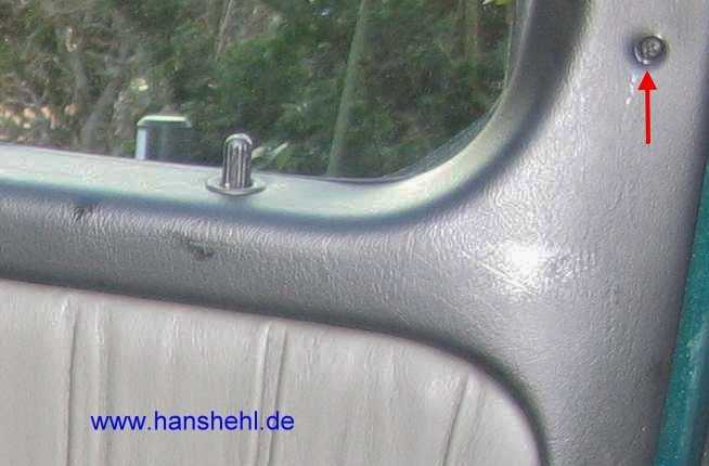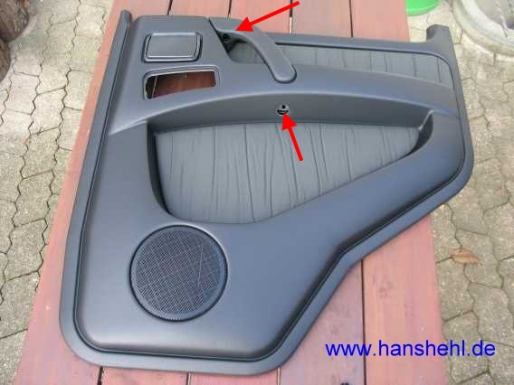 Als erstes muß man die Stöpsel in der Armlehnenunterseite und am Türöffner entfernen und die drei Schrauben (rote Pfeile, Kreuzschlitz) abschrauben. |