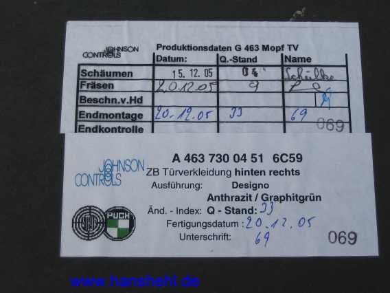In der Unterseite der Fahrer/Beifahrertür ist beim G55AMG eine Vorfeldbeleuchtung (Ausstiegsleuchte) 4638200001 eingebaut. Die Leuchte ist von außen eingesteckt. Der Blechrand sollte mit Wachs gut konserviert werden. |